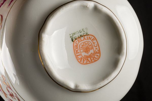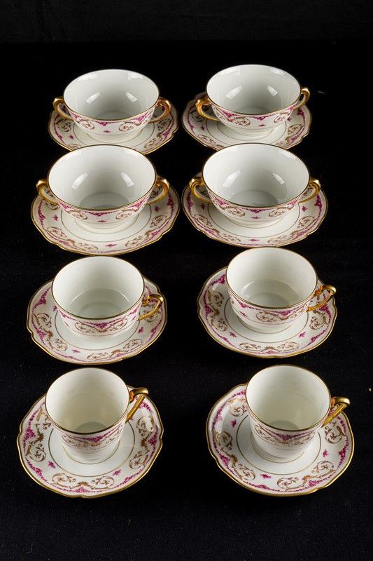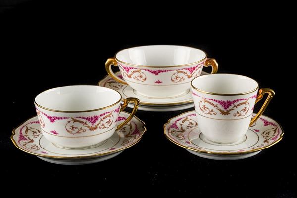 totale 48 pezzi, di cui 6 tazze da caffè con 6 piattini, 6 tazze da tè con 6 piattini, 12 tazze consommé con 12 piattini, decori stilizzati rosa e oro, piccole rotture