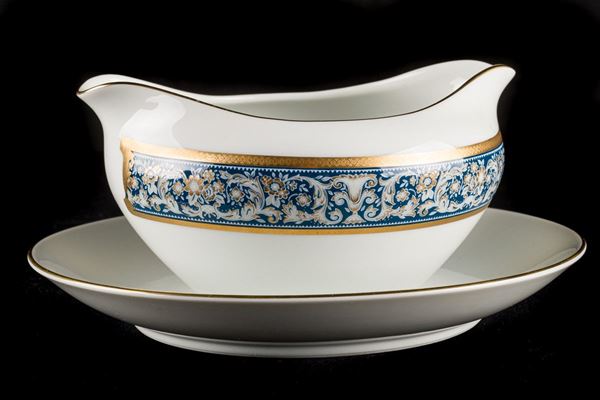 con bordi celesti e oro, 12 piatti fondi, 14 piatti piani, un piatto da portata e una salsiera, manifattura di Mantova
