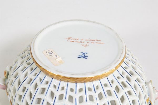 In porcellana bianca, con decori floreali policromi e finiture in oro. Anse a nastro.
