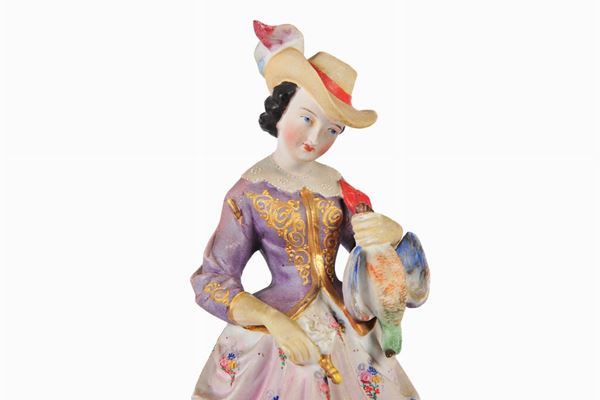 Scultura in volume in porcellana policroma non smaltata, vestita alla moda Settecentesca. Numerata e siglata alla base.
