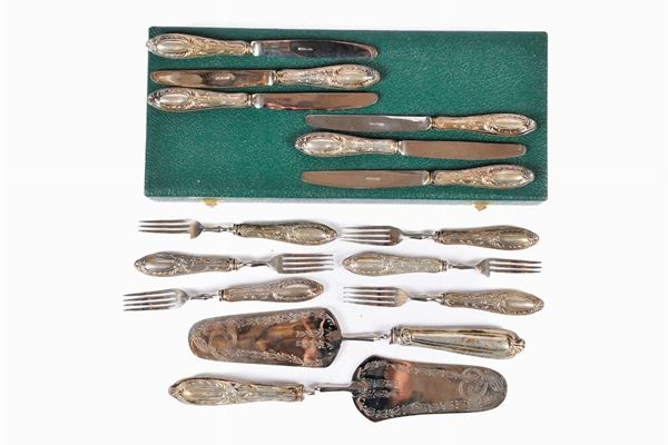 Composto da 6 coltelli, 2 palette da dolce, 6 forchette, con manici in argento 800/1000, entro astuccio. Parti rotte e staccate.