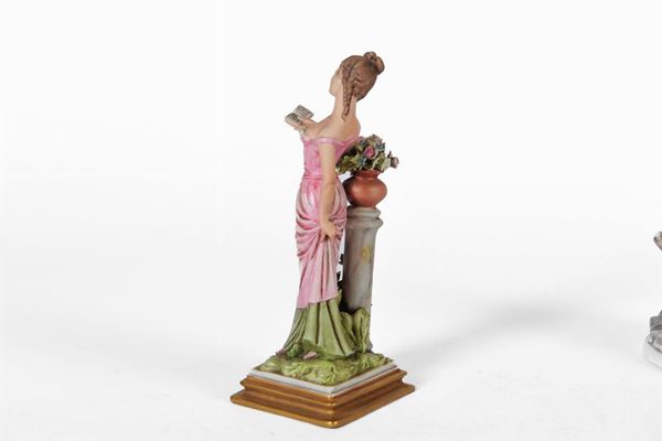 In volume, in porcellana policroma. Una rappresentante coppia di nonni seduti su panchina (20 x 18 x 11,5 cm) e l’altra rappresentante una fanciulla in lettura (19 x 7,5 x 7,5 cm). N coronata in blu sottosmalto alla base.