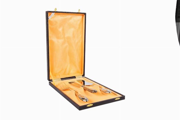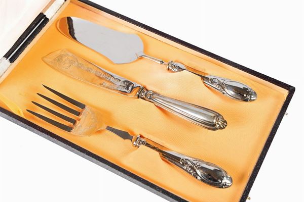 Composto da paletta, coltello e forchetta da desserts con manici in argento 800/1000. Entro astuccio. Parti scompagnate.