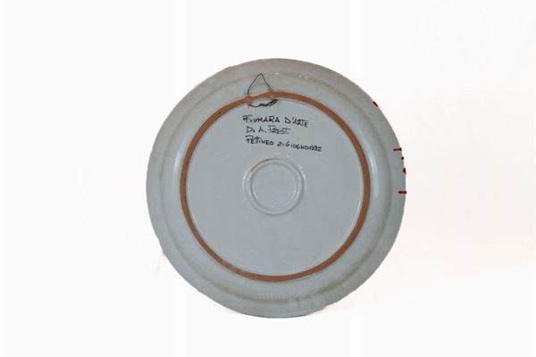 tondo con decoro a smalto rosso su fondo bianco e motivi geometrici a stecca, firmato e datato al retro.