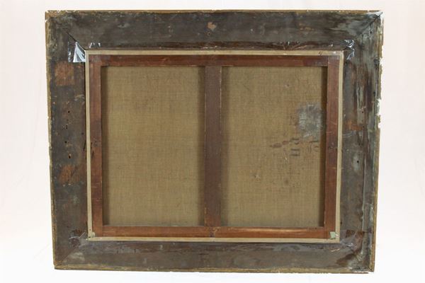 firmato e datato in basso a sinistra, reca un piccolo taglio al centro, entro cornice non coeva in legno e stucco dorato, con leggere mancanze.