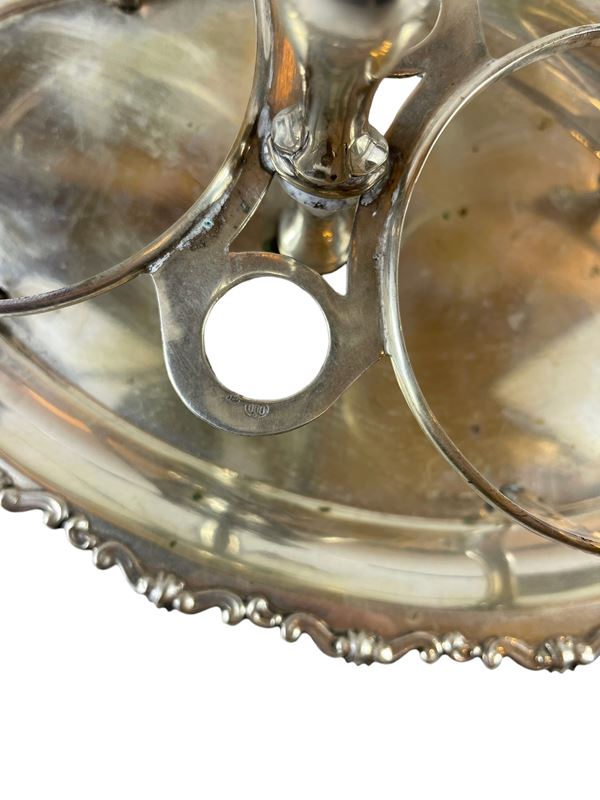 Con coppia di dispensiere in vetro tagliato alla mola di cui una con bordo rotto. Argento 800/1000.