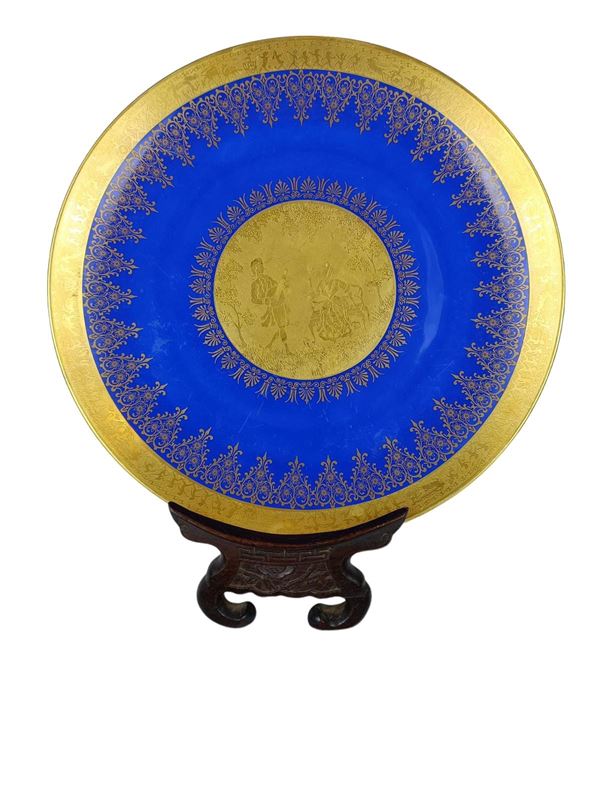 In porcellana a fondo blu con decoro floreale in oro zecchino e scena cortese nel fondo.