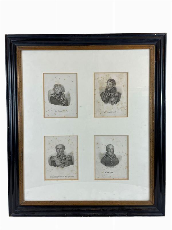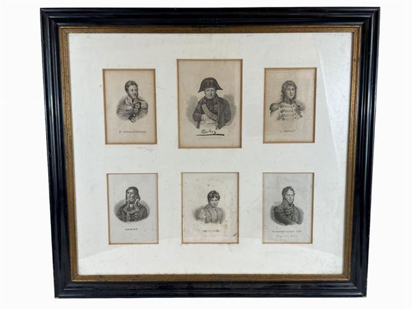 Insieme di 14 multipli su carta, in tre raccolte, con cornice nera evanizzata, rappresentanti Napoleone I e personaggi a lui contemporanei.