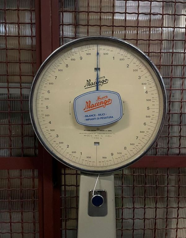Bilancia portata 120 kg, funzionante con base a carrello, altezza base 60 cm.