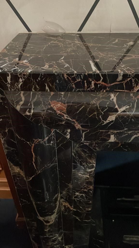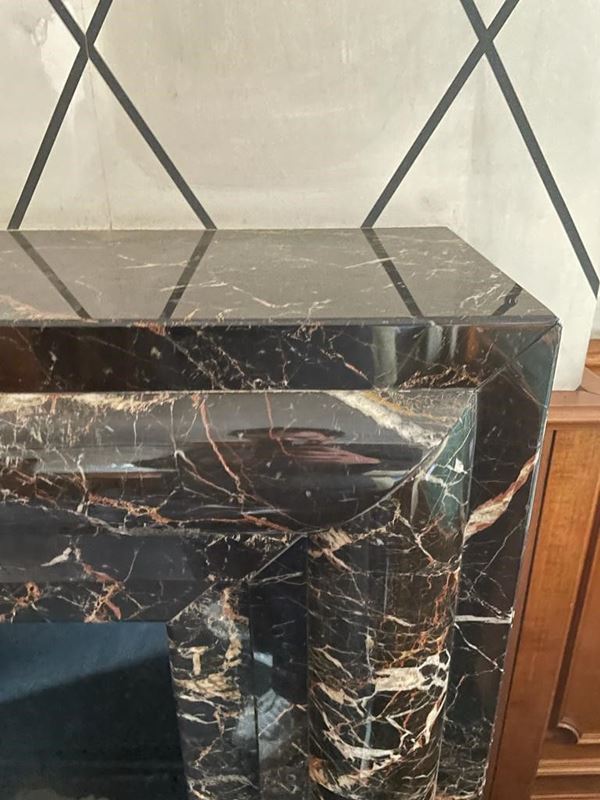 Cornice da camino in marmo Portoro, formato da quattro pezzi, due laterali, uno frontale e base, con predisposizione per camino a etanolo, con fondo specchiato.