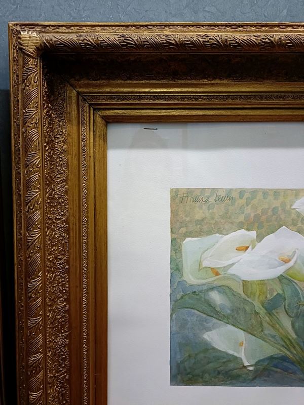 In legno dorato. Acquerelli a soggetto floreale, firmati in basso a destra.