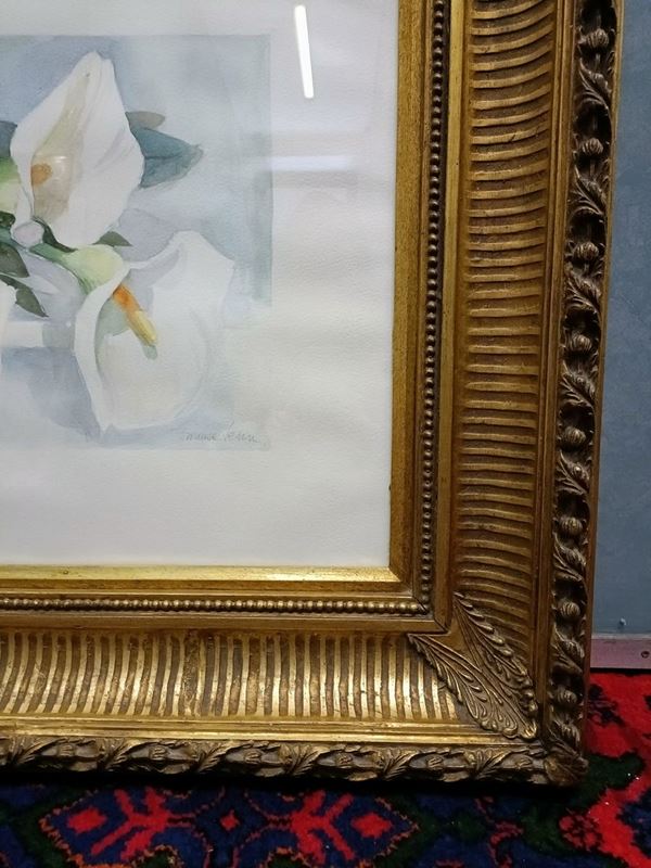 In legno dorato. Acquerelli a soggetto floreale, firmati in basso a destra.
