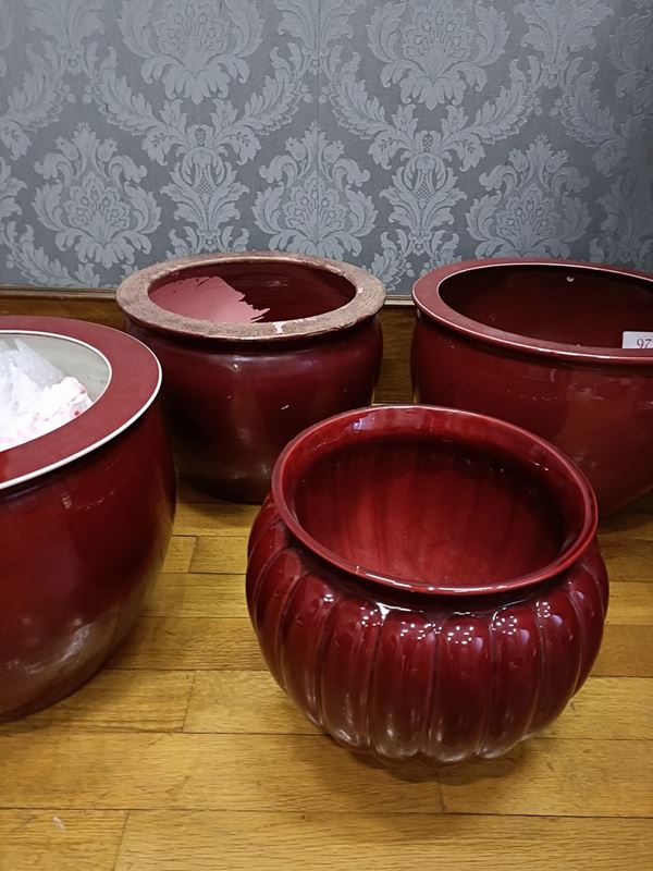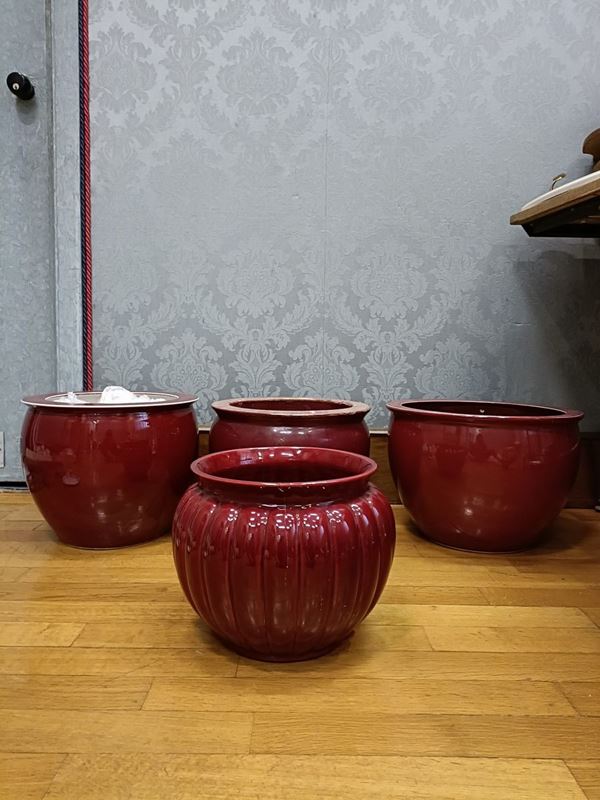 In ceramica laccata di color rosso lucido. Dimensioni del vaso più grande: 30 x 42 cm.