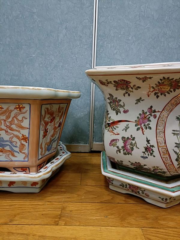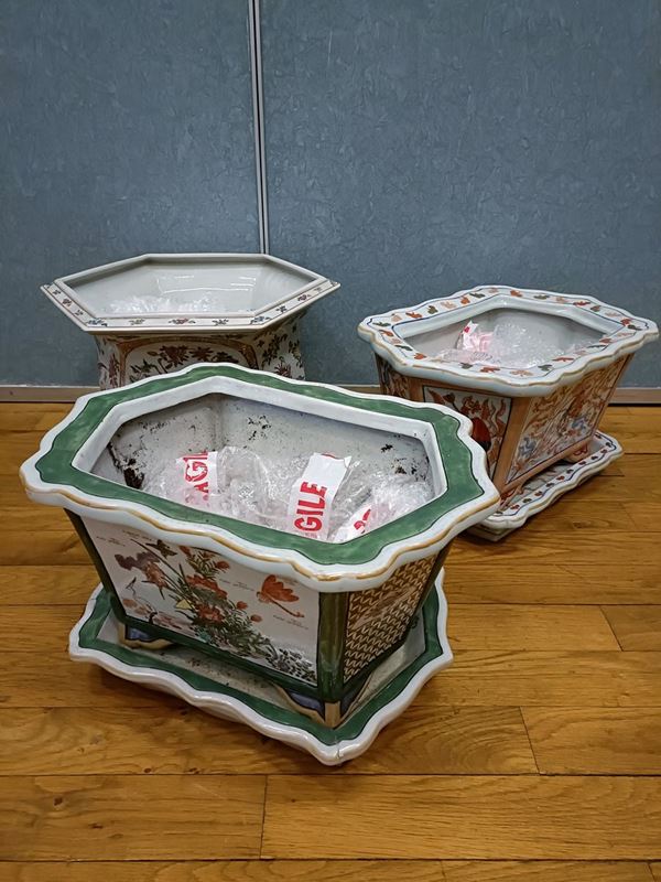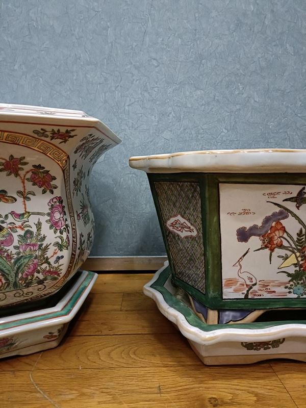 In ceramica smaltata policroma, forati alla base e compresi di sottovaso. Forme e misure diverse. Dimensioni comprese di sottovaso: 29 x 41 x 37 cm; la coppia di vasi più piccoli: 25 x 44 x 30 cm (le misure si intendono prese all'apertura superiore).