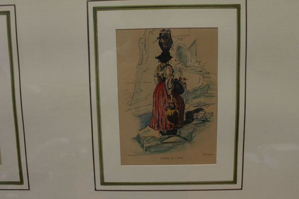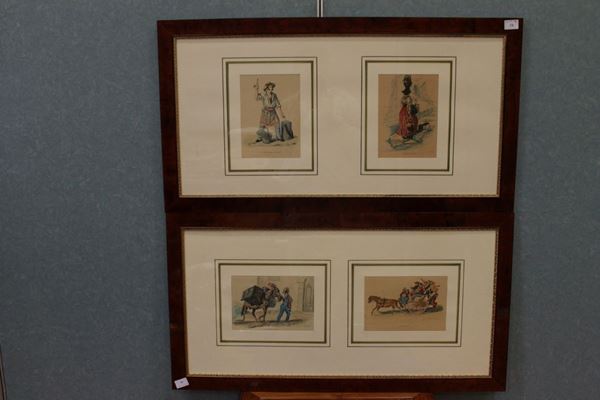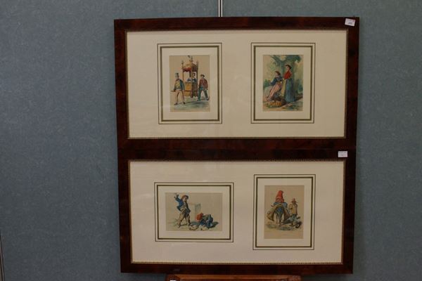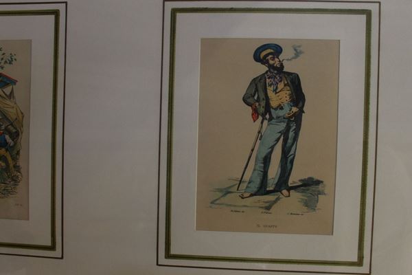Lotto di otto cornici, ognuna contenente una coppia di stampe, tratte da "Usi e costumi di Napoli e contorni descritti e dipinti" di Francesco Bourcard.