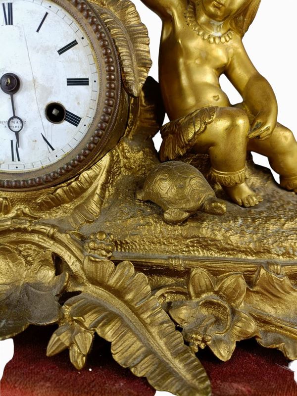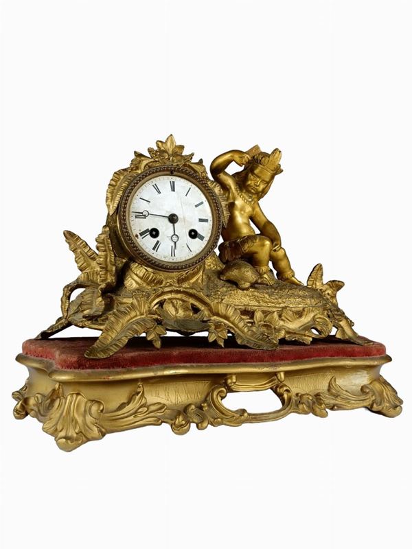 Pendolo da tavolo in bronzo e antimonio, con base in legno dorato. Meccanica non funzionante.