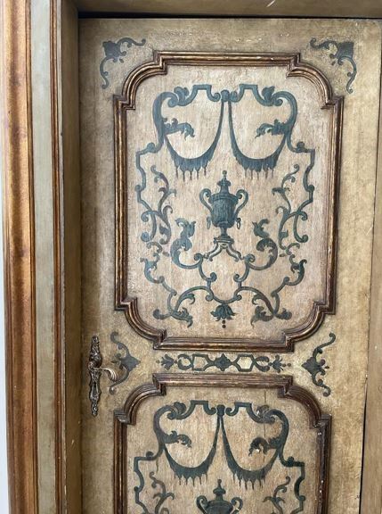 con doppio riquadro, scorniciature in legno dorato e parti centrali decorate in lacca policroma, maniglie in bronzo ed imbotto in legno dorato laccato (15 cm), retro in lacca nera senza decorazioni. Cimasa non in vendita.