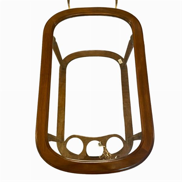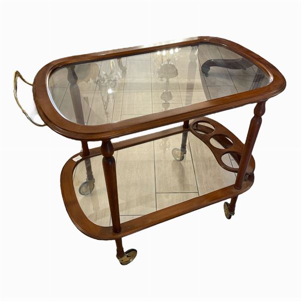 In legno, con doppio ripiano in vetro e portabottiglie, manico in ottone, 4 ruote. Manifattura italiana.