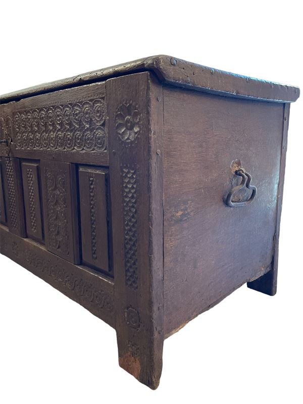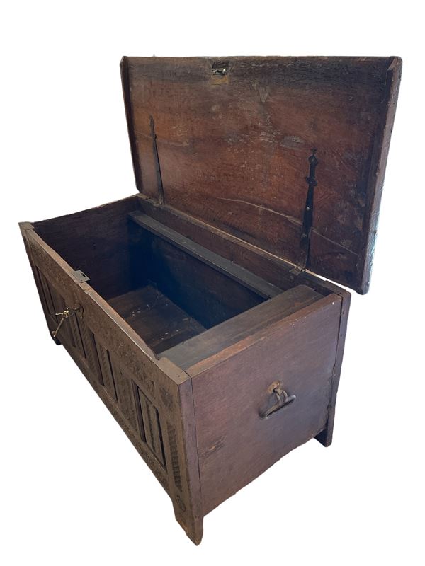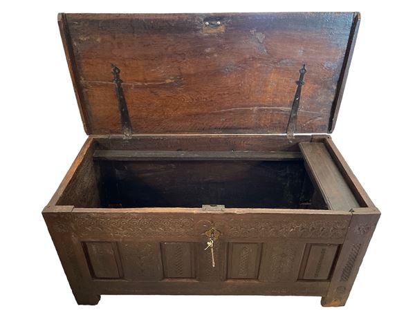 in legno di castagno intagliato a motivi geometrici, piano superiore ribaltabile. Manifattura nordica