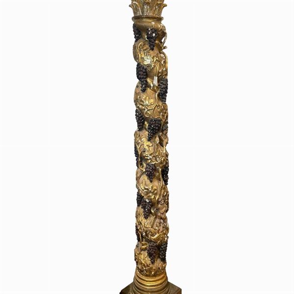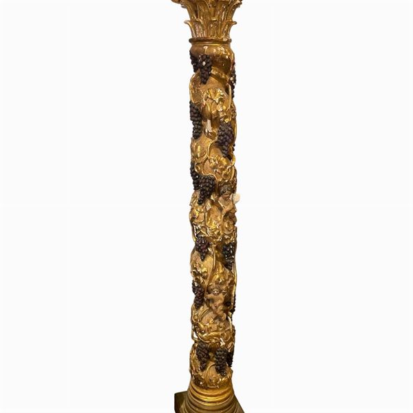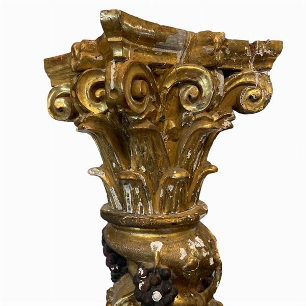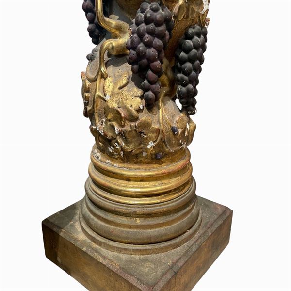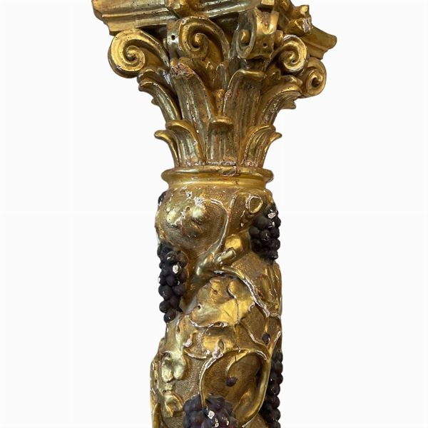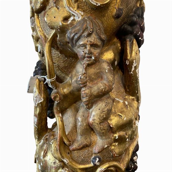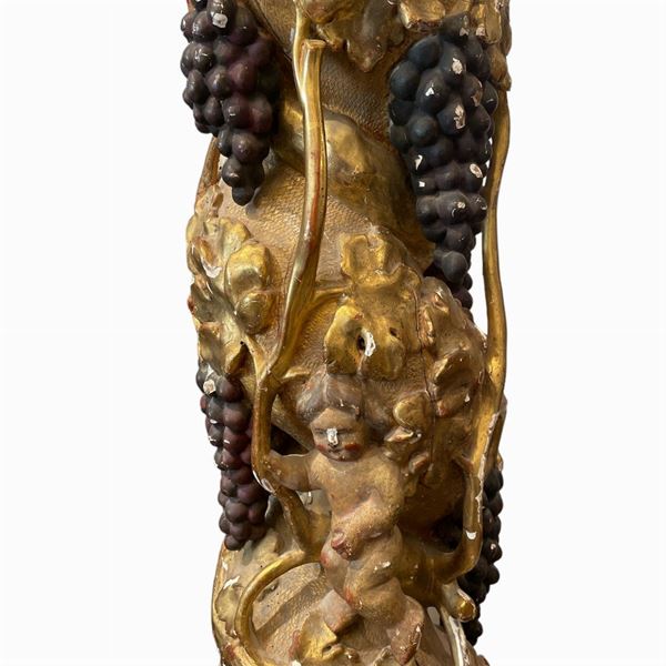 In legno intagliato e dorato a motivi di tralci d'uva e putti policromi, basamento e capitello superiori. Restauri e mancanze.