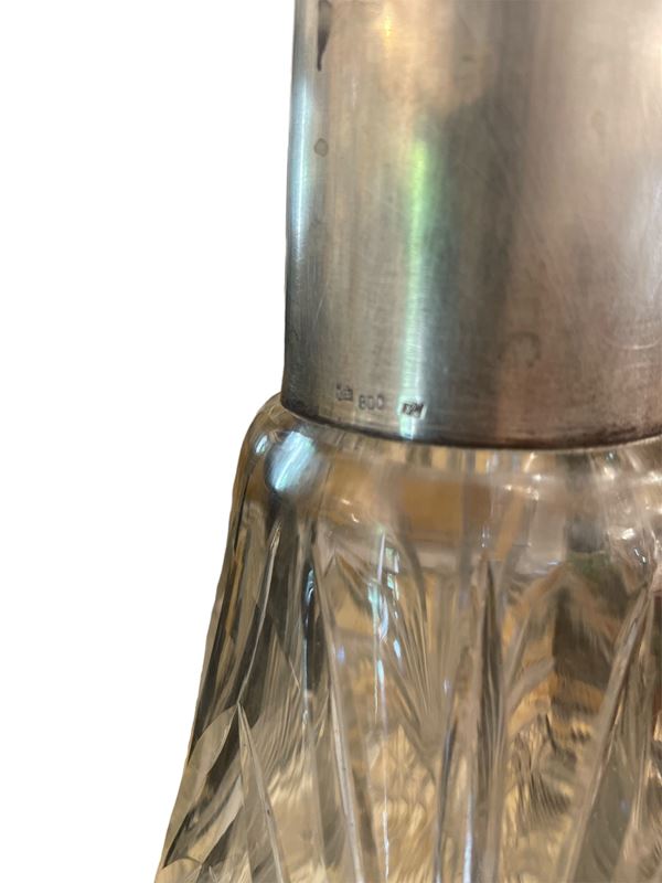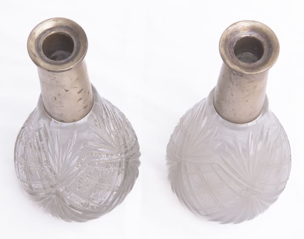 Bottiglie in vetro molato con collo in argento 800. Stampigliature. Tappi adattati