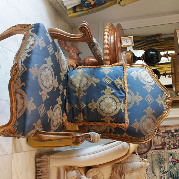Di linea Luigi XV, in legno intagliato e dorato. Foderate di stoffa blu con decori dorati. Sono da considerarsi senza cuscini.