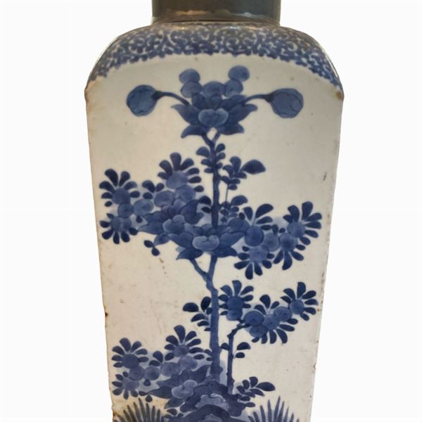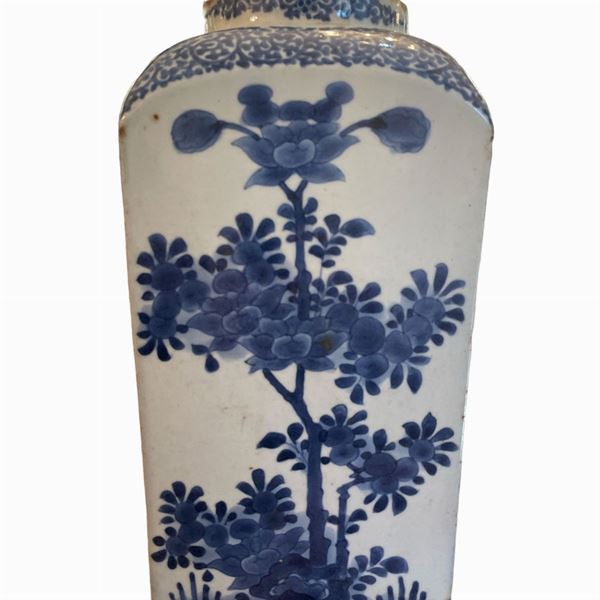 In porcellana bianca, con decoro floreale blu, di forma quadrangolare. Mancante di coperchio, l'altro trasformato a base di lampada. Cina, metà XIX secolo. Piccole mancanze.