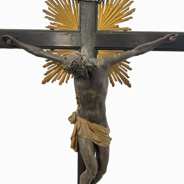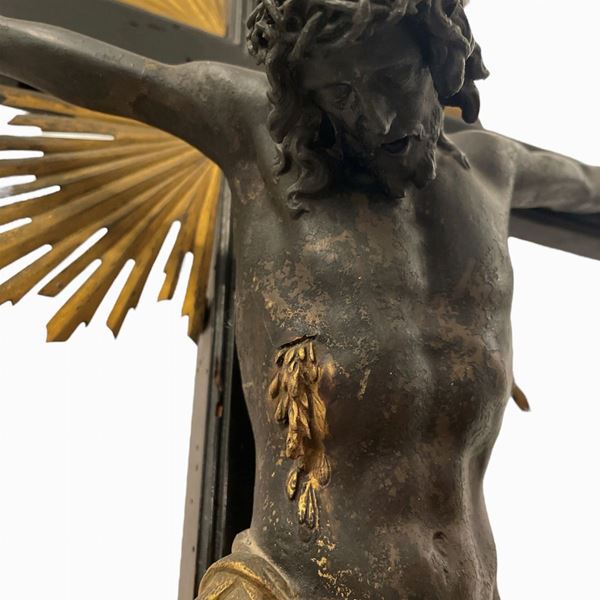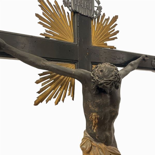in legno ebanizzato con decorazioni in argento e metallo dorato. Cristo in bronzo brunito con lumeggiature dorate. Manifattura romana. Cristo del XVII sec. Croce di epoca posteriore XIX sec.