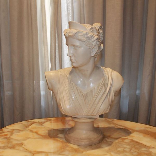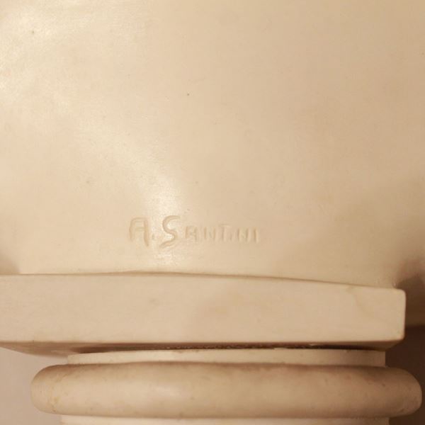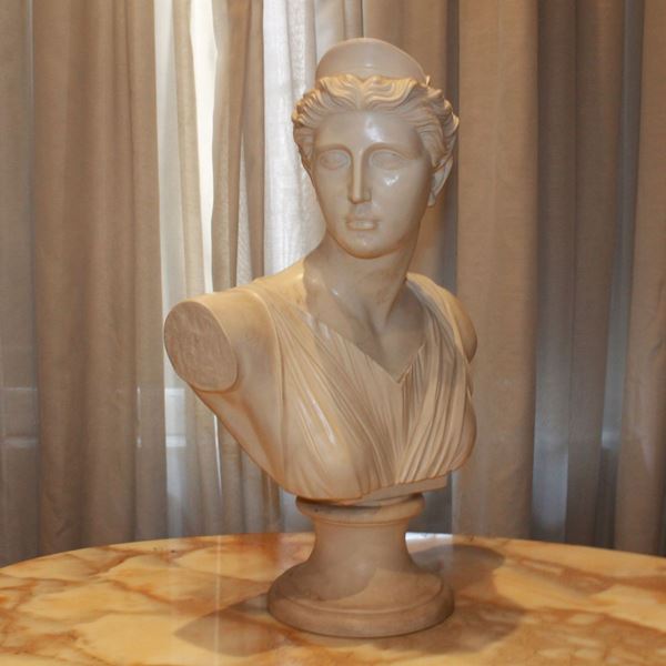 Busto in resina, raffigurante Diana cacciatrice. Reca firma A.Santini sul retro.