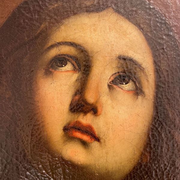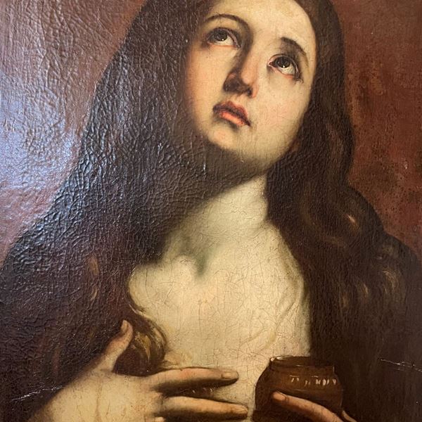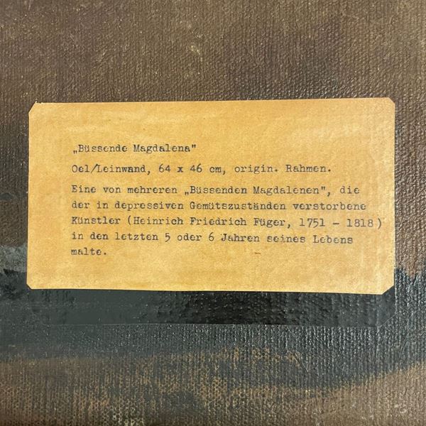 Cartiglio al retro in cui si attribuisce l'opera a Füger: "Una delle molte Maddalene Penitenti che l'artista, morto in uno stato depressivo, dipinse negli ultimi 5 o 6 anni della sua vita." Con timbro di appartenenza a una collezione viennese. Dal prototipo di Guido Reni. In cornice.