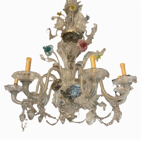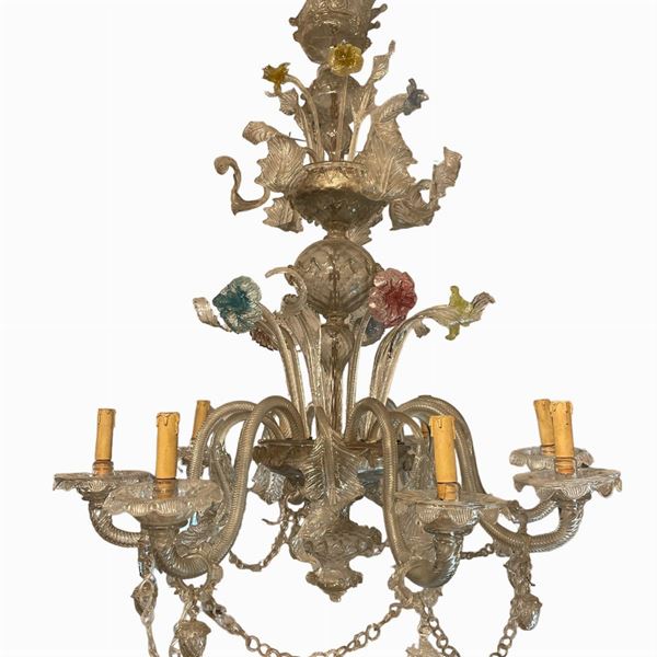 in vetro soffiato di Murano, a 8 braccia con decori floreali colorati. Manifattura veneta. Una foglia staccata ma presente