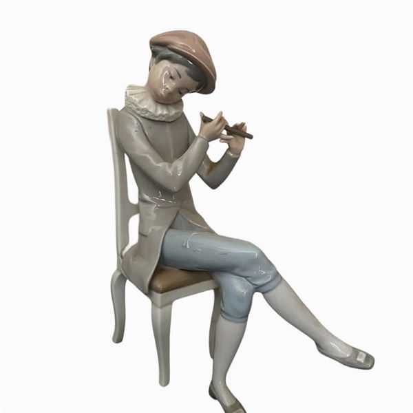 Pierrot con Ballerina, misure: H. 23,5 x 37 x 14 cm. Difetti e mancanze. Marchiato alla base. Suonatore di flauto, misure: h. 25 x 19 x 8 cm. Integro. marchiato alla base.