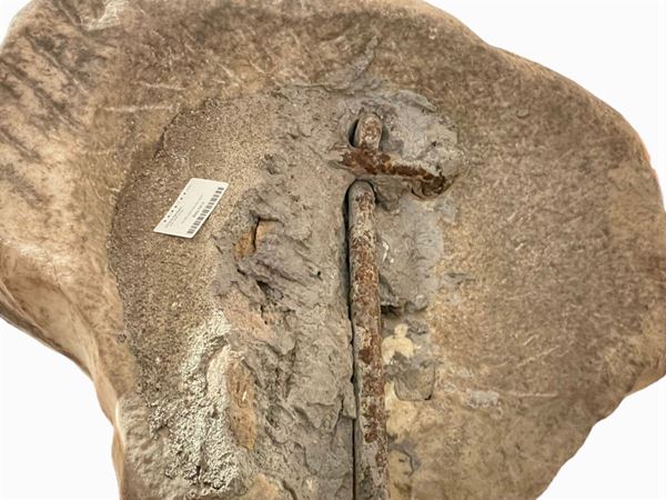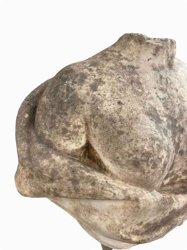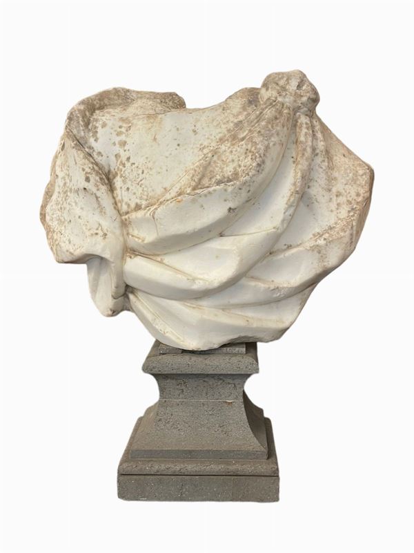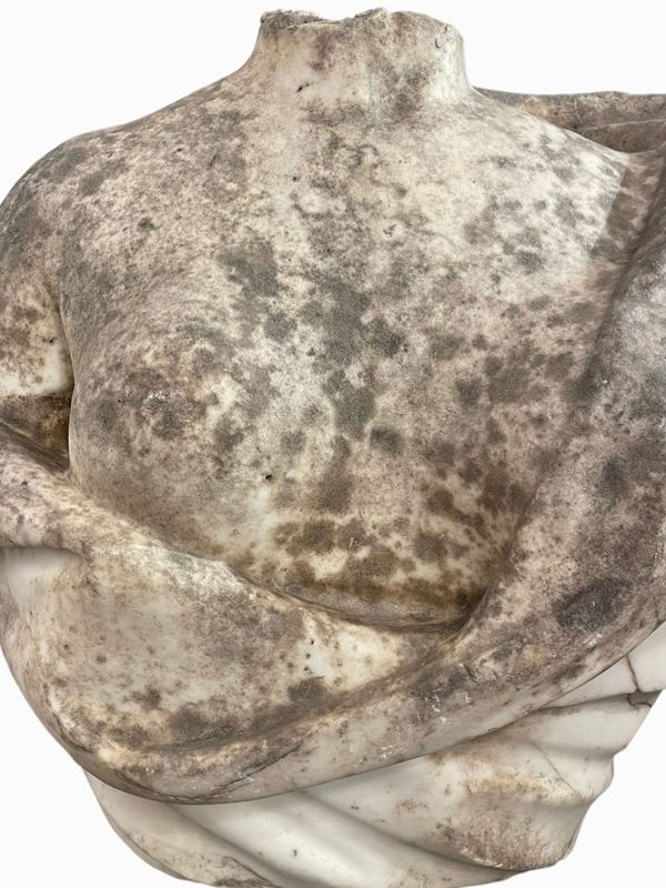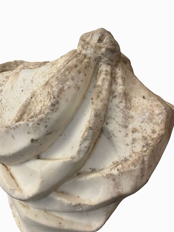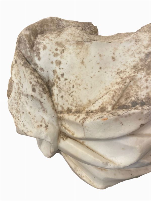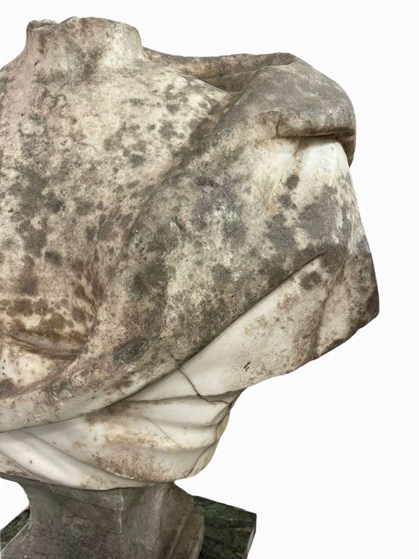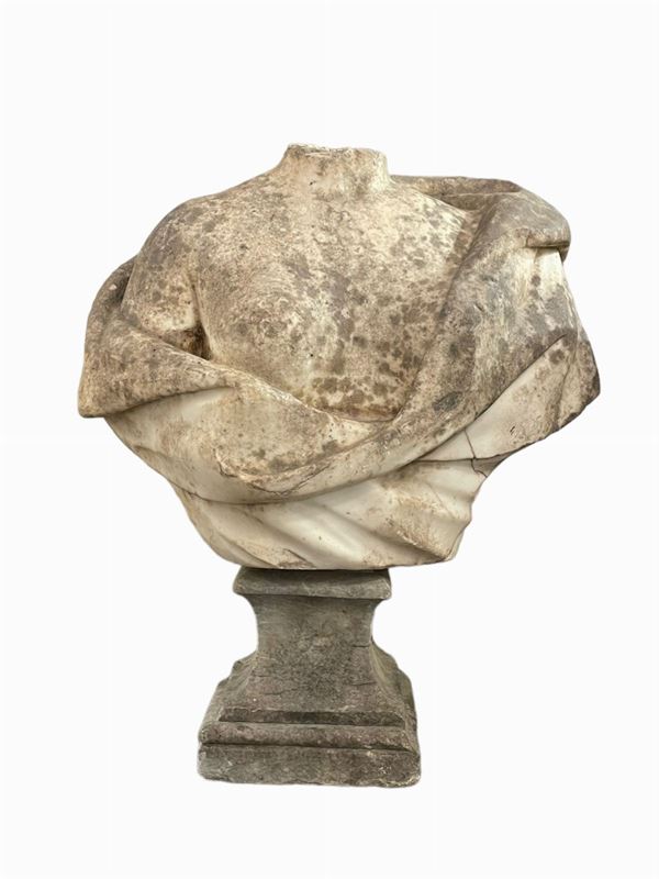 Sculture in volume in marmo bianco su base a plinto. Acefale, una maschile e l'altra femminile, togate con spalla scoperta trattenuta da una spilla sull'altro lato. Rotture e mancanze.