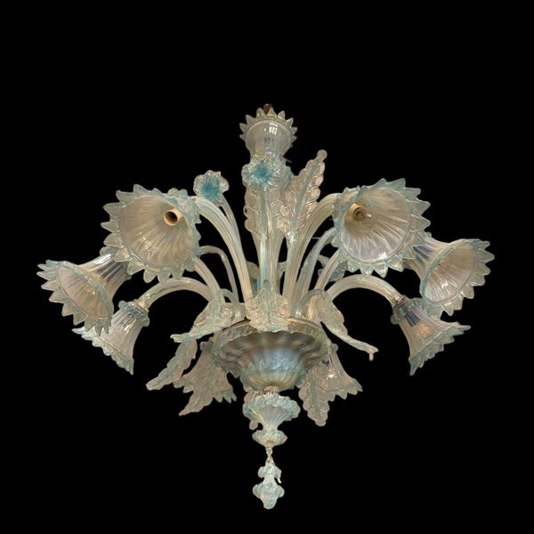 Lampadario in vetro soffiato di Murano turchese, inizio XX sec.