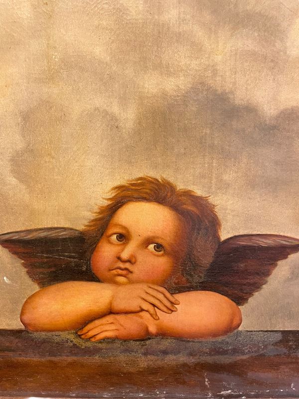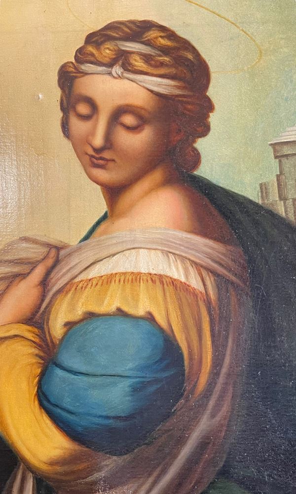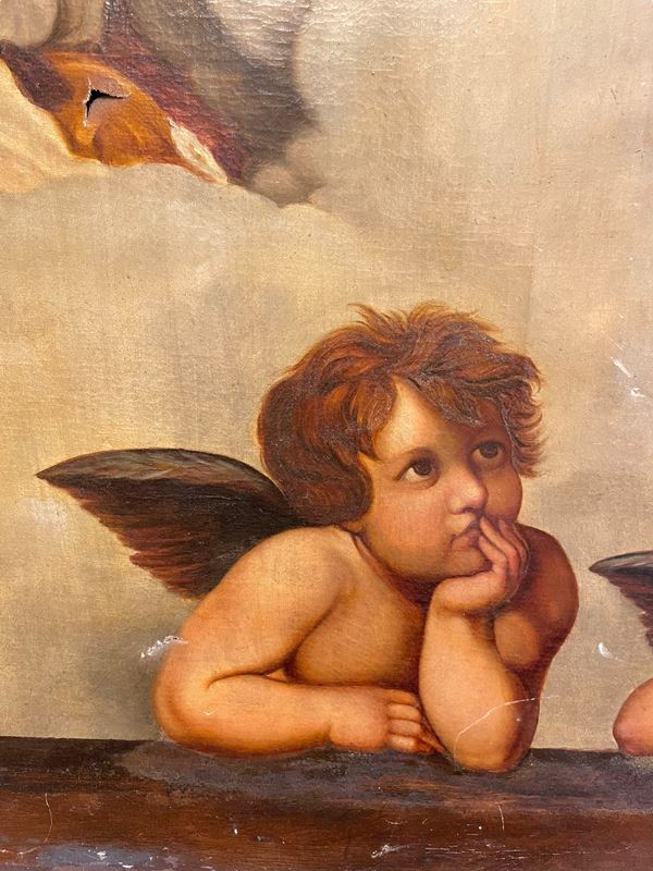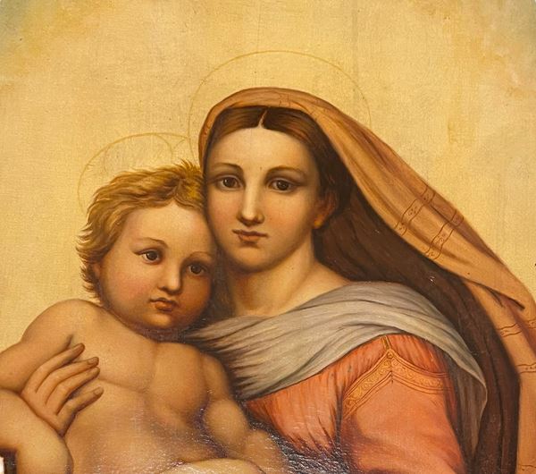 Il celebre dipinto di Raffaello, attualmente conservato a Dresda, è qui presentato in una bella riproduzione ottocentesca. Al retro reca iscrizione e data. In cornice.