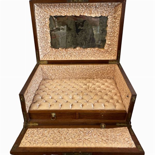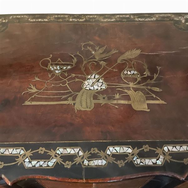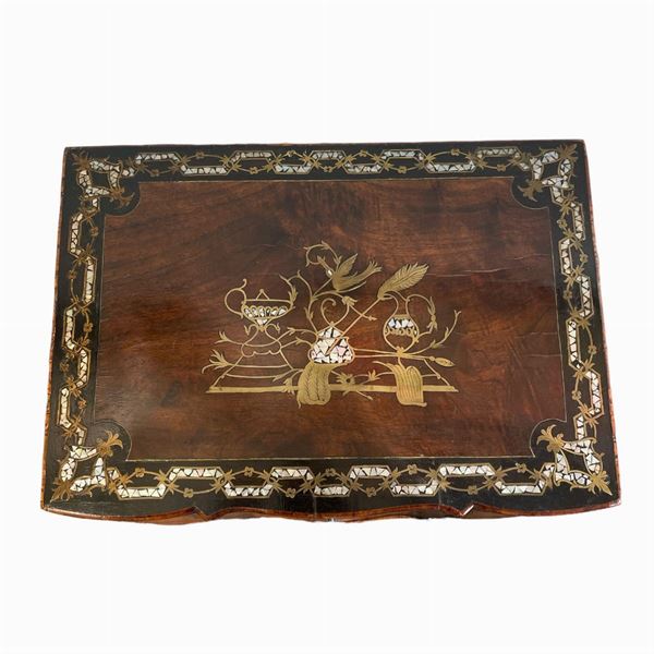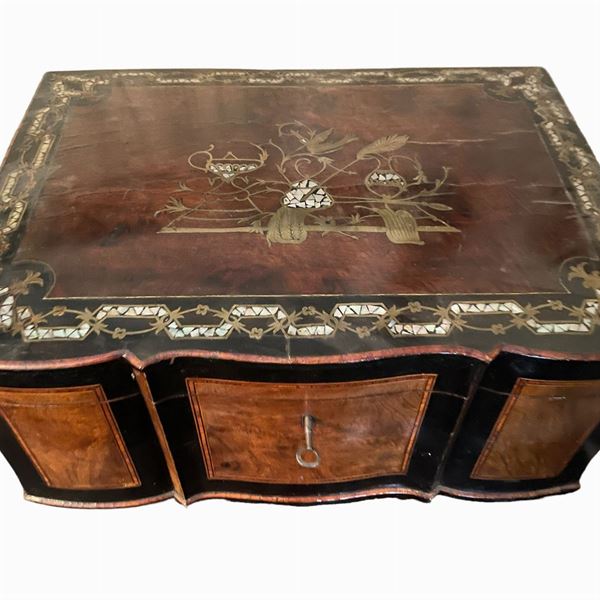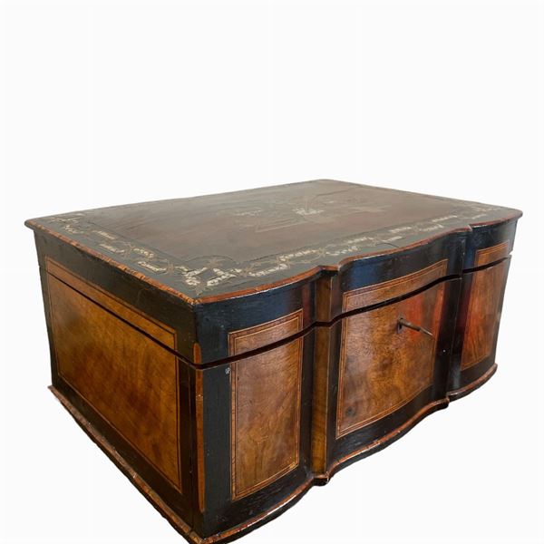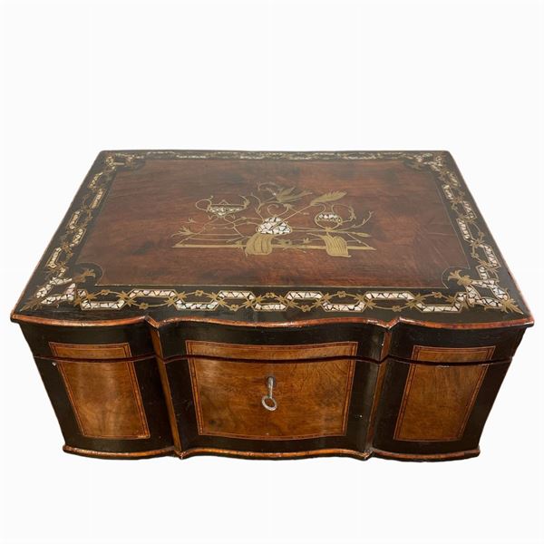 con piano ribaltabile in legno ebanizzato e riquadri in radica di noce e intarsi in madreperla e ottone. Fronte centinato, rivestimento e specchio interno. Manifattura Francese, Napoleone III.