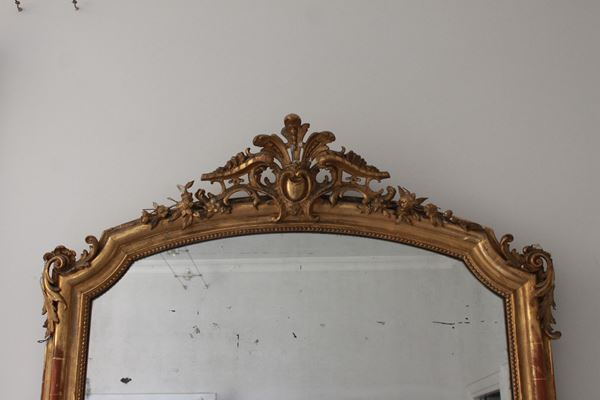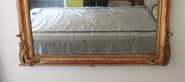 Grande specchiera in legno dorato, con parti in rilievo in pastiglia. Manifattura francese, in stile Luigi Filippo. Difetti e mancanze.