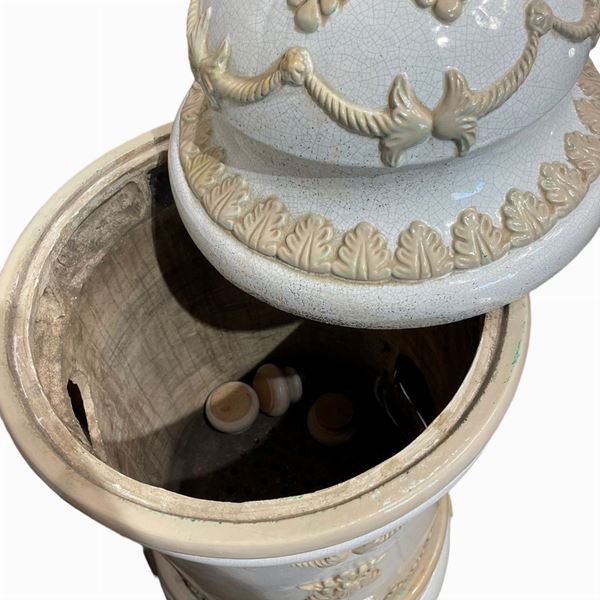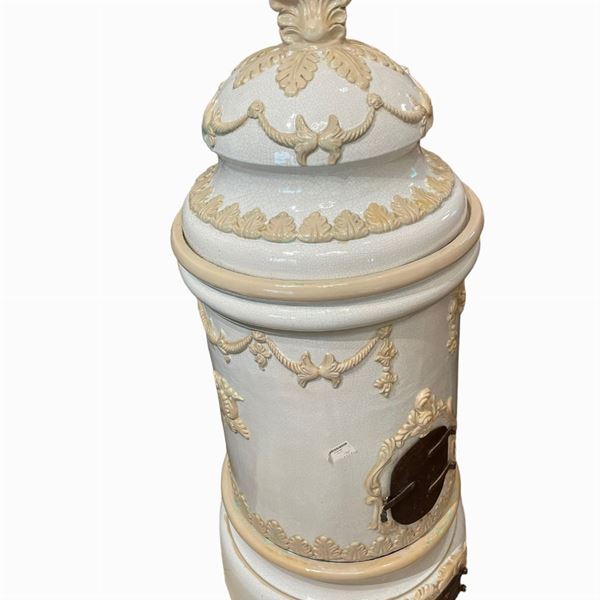 Stufa da centro con struttura circolare in maiolica smaltata. Composta da tre pezzi: base, corpo centrale e cappello. Piedini d'appoggio presenti ma smontati.