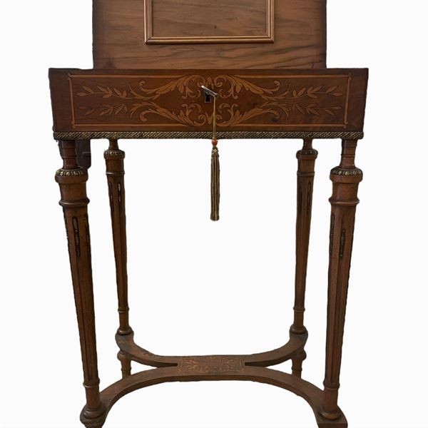 in legno di noce con intarsi in legno di frutto. Piano a ribalta e quattro gambe scanalate, raccordate da crociera centrale.