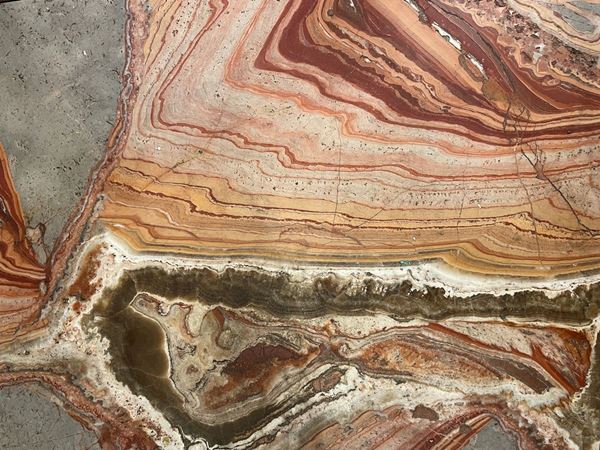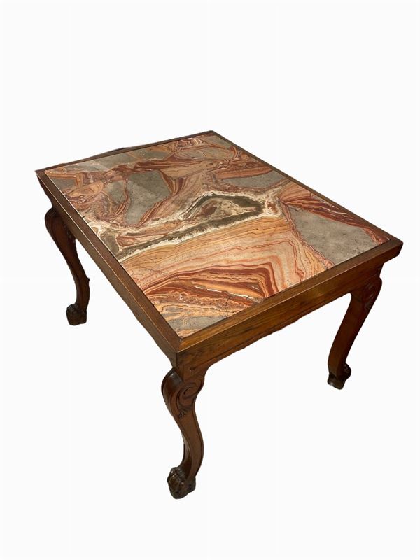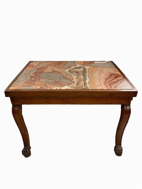 Di forma rettangolare, in legno di rovere intagliato con 4 piedi con finale a zampa di leone, piano superiore incassato in marmo portasanta. Manifattura inglese di linea Regency.