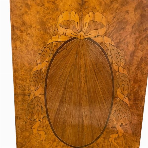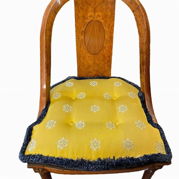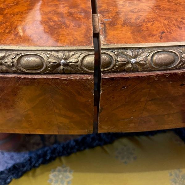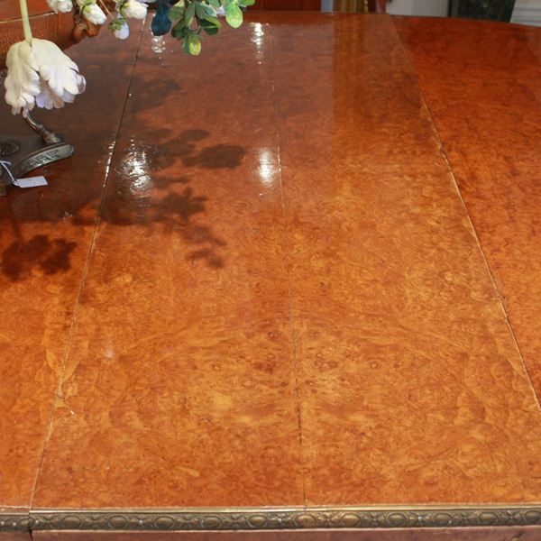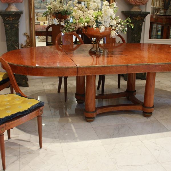 Con decorazioni in bronzo e radica di tuia, compreso di due prolunghe con fascia laterale. 75 x 148 x 124 ( prolunghe 50 x 124 cm ). Gruppo di sei sedie a faldina in radica di tuia con decori in bronzo. Il lotto è parte della grande Sala da Pranzo composta da tavolo, sei sedie, servante e contro servante.