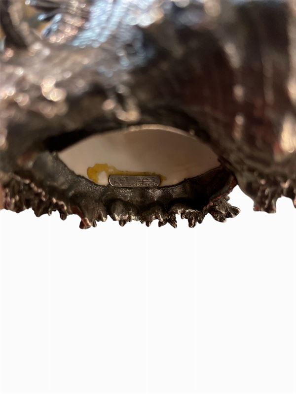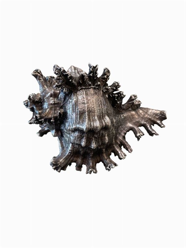 Una conchiglia presenta piccole mancanze di argentatura nella parte di appoggio inferiore. La maggiore misura: 6 x 10 x 6 cm; la minore: 3,5 x 8 x 7 cm. Conchiglia Murex, punzonata Federico Bucellati, misure: 6,5 x 10,5 x 7,5 cm.