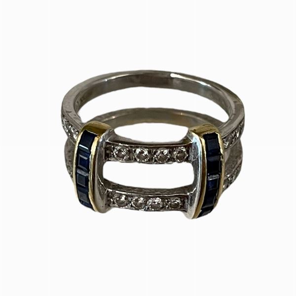 in oro bianco a doppio cerchio unito da traverse orizzontali, finitura a brillantini e zaffiri. Peso grammi totali 7.2