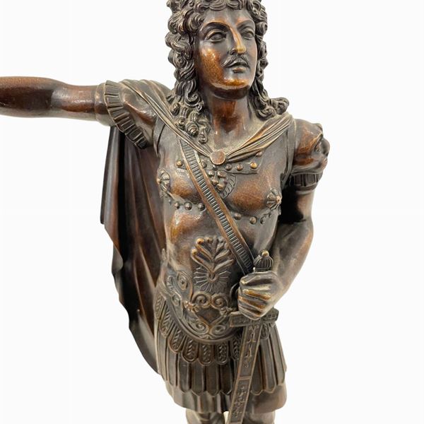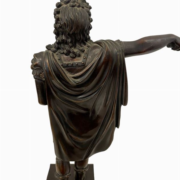 scultura in volume, in bronzo a patina bruna, su base a plinto. Difetti, base d'appoggio leggermente piegata