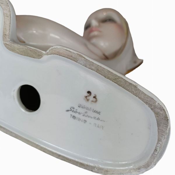 In terracotta modellata a colaggio; rifiniture in oro e volto dipinto a mano. Sotto la base: Ronzan. Ottime condizioni conservative.
