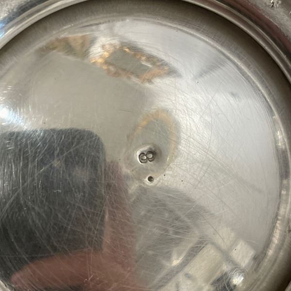 Argento 800 su 1000, manico in legno, corpo globulare scanalato, con cifre incise. Peso lordo 816 grammi