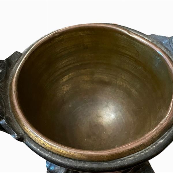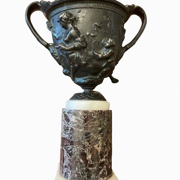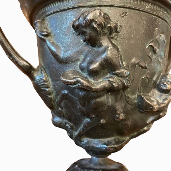 In bronzo a due anse a nastro, con figure in rilievo lungo tutto il corpo. Basamento in materiale lapideo. Una parte mancante (ala di putto).