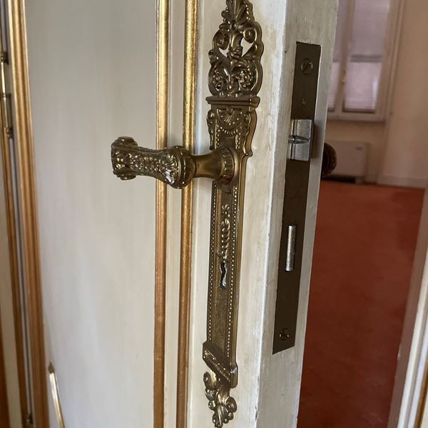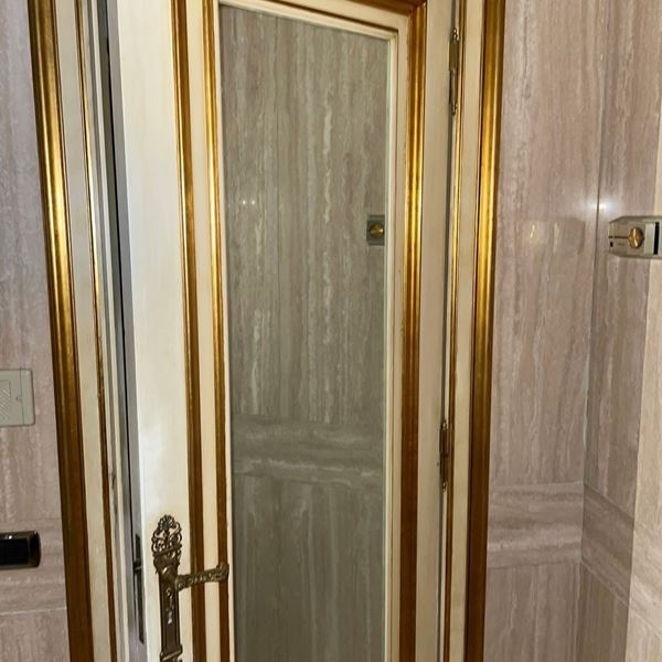 laccate e decorate, maniglia presente su ambo i lati, sottile fenditura per areazione nella parte inferiore. Una delle due specchiata su un lato. Misure cornice H 223 x 103 cm, porta H 213 x 82 cm, spessore imbotto 15 cm - 20 cm