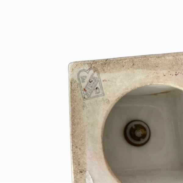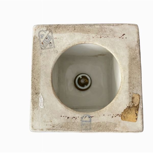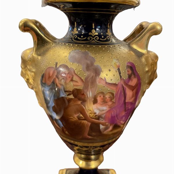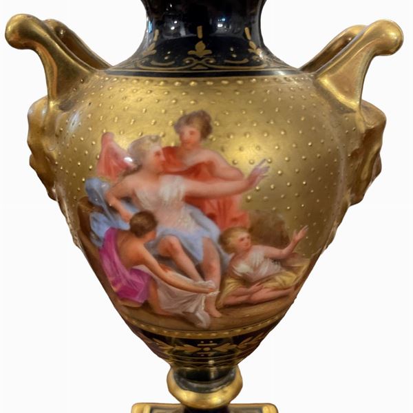 In porcellana policroma a fondo blu ed oro zecchino, di forma a balaustro, con scene di amorini sul corpo e scene dalla mitologia classica. Decoro floreale in oro zecchino su fondo blu, sulla base e sul coperchio. Manifattura di Augarten, Vienna.