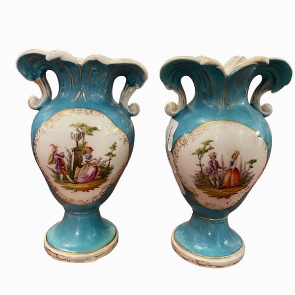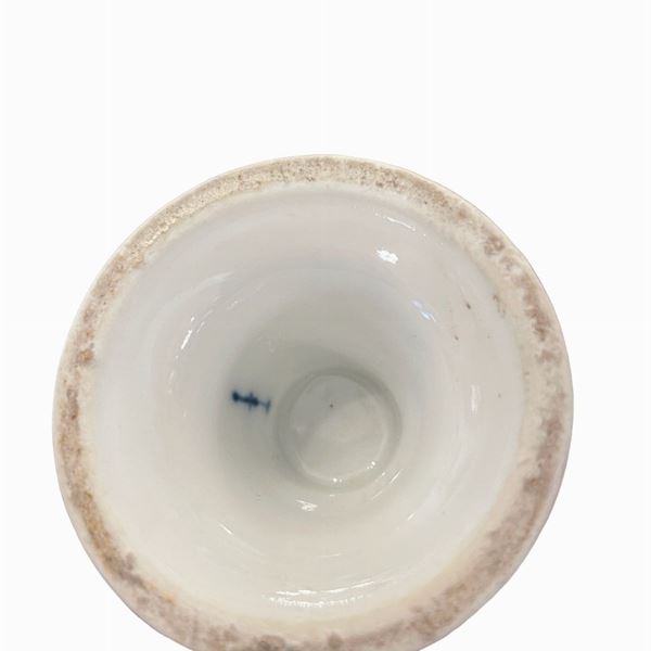 In porcellana, a balaustro, con orlo superiore a fiore sbocciato, di colore turchese con scene galanti entro riserve bianche e finiture in oro zecchino. Marchio sotto la base in blu sotto smalto, manifattura imperiale di Berlino
